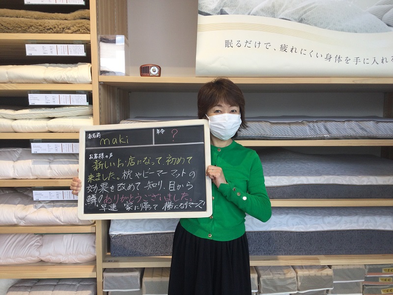 新しいお店になって、初めて来ました。枕やビーマーマットの効果を改めて知り、目から鱗!ありがとうございました。さっそく家に帰って横になりまーす!